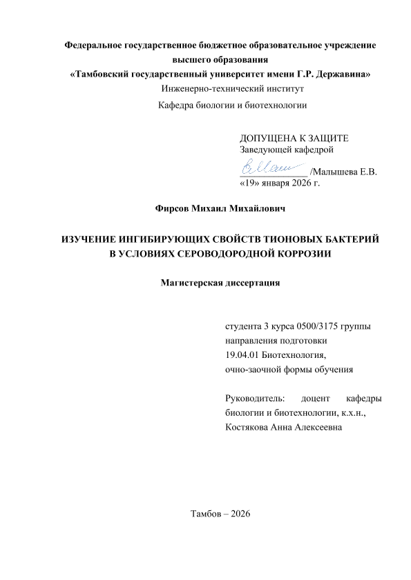 ФИРСОВ, МИХАИЛ МИХАЙЛОВИЧ. ИЗУЧЕНИЕ ИНГИБИРУЮЩИХ СВОЙСТВ ТИОНОВЫХ БАКТЕРИЙ В УСЛОВИЯХ СЕРОВОДОРОДНОЙ КОРРОЗИИ [Электронный ресурс]: магистерская диссертация: 19.04.01 Биотехнология: Очно-заочная форма обучения / М. М. ФИРСОВ; ТГУ им. Г. Р. Державина ; науч. рук. к. б. н., доцент, А. А. Костякова. — Электрон. текстовые дан. (1 файл). — Тамбов, 2026. — Загл. с титул. экрана. — <URL:https://elibrary.tsutmb.ru/dl/docs/vkr18715.pdf>.