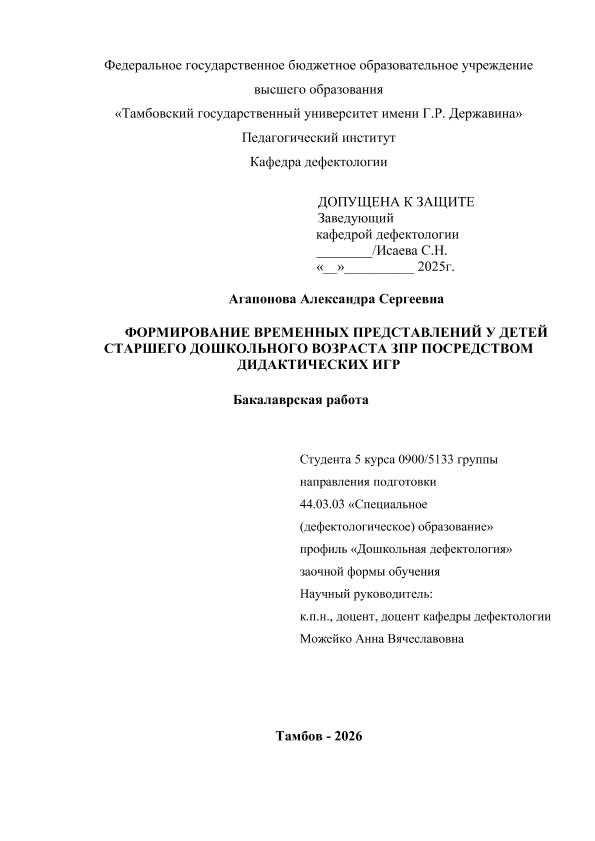 АГАПОНОВА, АЛЕКСАНДРА СЕРГЕЕВНА. ФОРМИРОВАНИЕ ВРЕМЕННЫХ ПРЕДСТАВЛЕНИЙ У ДЕТЕЙ СТАРШЕГО ДОШКОЛЬНОГО ВОЗРАСТА ЗПР ПОСРЕДСТВОМ ДИДАКТИЧЕСКИХ ИГР [Электронный ресурс]: бакалаврская работа: 44.03.03 Специальное (дефектологическое) образование: Дошкольная дефектология: Заочная форма обучения / А. С. АГАПОНОВА; ТГУ им. Г. Р. Державина ; науч. рук. к. пед. н., доцент, А. В. Можейко. — Электрон. текстовые дан. (1 файл). — Тамбов, 2025. — Загл. с титул. экрана. — <URL:https://elibrary.tsutmb.ru/dl/docs/vkr18716.pdf>.