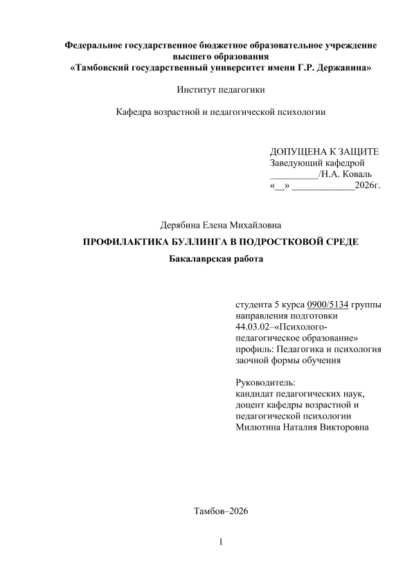 ДЕРЯБИНА, ЕЛЕНА МИХАЙЛОВНА. ПРОФИЛАКТИКА БУЛЛИНГА В ПОДРОСТКОВОЙ СРЕДЕ [Электронный ресурс]: бакалаврская работа: 44.03.02 Психолого-педагогическое образование: Педагогика и психология: Заочная форма обучения / Е. М. ДЕРЯБИНА; ТГУ им. Г. Р. Державина ; науч. рук. к. пед. н., доцент, Н. В. Милютина. — Электрон. текстовые дан. (1 файл). — Тамбов, 2026. — Загл. с титул. экрана. — <URL:https://elibrary.tsutmb.ru/dl/docs/vkr18777.pdf>.