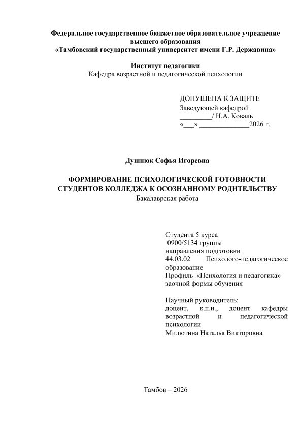 ДУШНЮК, СОФЬЯ ИГОРЕВНА. ФОРМИРОВАНИЕ ПСИХОЛОГИЧЕСКОЙ ГОТОВНОСТИ СТУДЕНТОВ КОЛЛЕДЖА К ОСОЗНАННОМУ РОДИТЕЛЬСТВУ [Электронный ресурс]: бакалаврская работа: 44.03.02 Психолого-педагогическое образование: Педагогика и психология: Заочная форма обучения / С. И. ДУШНЮК; ТГУ им. Г. Р. Державина ; науч. рук. к. пед. н., доцент, Н. В. Милютина. — Электрон. текстовые дан. (1 файл). — Тамбов, 2026. — Загл. с титул. экрана. — <URL:https://elibrary.tsutmb.ru/dl/docs/vkr18778.pdf>.