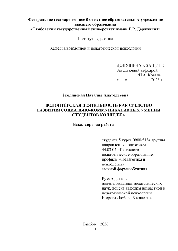 ЗЕМЛЯНСКАЯ, НАТАЛИЯ АНАТОЛЬЕВНА. ВОЛОНТЕРСКАЯ ДЕЯТЕЛЬНОСТЬ КАК СРЕДСТВО РАЗВИТИЯ СОЦИАЛЬНО-КОММУНИКАТИВНЫХ УМЕНИЙ СТУДЕНТОВ КОЛЛЕДЖА [Электронный ресурс]: бакалаврская работа: 44.03.02 Психолого-педагогическое образование: Педагогика и психология: Заочная форма обучения / Н. А. ЗЕМЛЯНСКАЯ; ТГУ им. Г. Р. Державина ; науч. рук. к. пед. н., доцент, Л. Х. Егорова. — Электрон. текстовые дан. (1 файл). — Тамбов, 2026. — Загл. с титул. экрана. — <URL:https://elibrary.tsutmb.ru/dl/docs/vkr18779.pdf>.