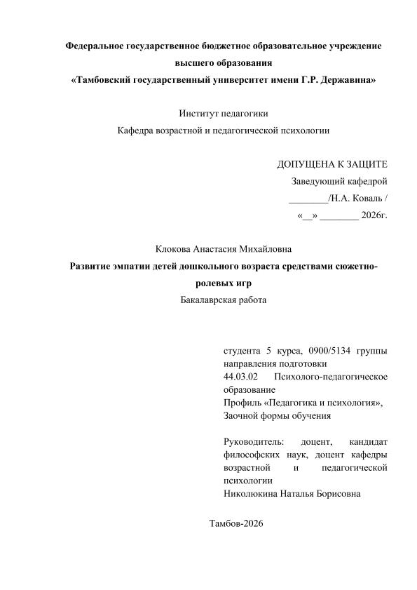 КЛОКОВА, АНАСТАСИЯ МИХАЙЛОВНА. РАЗВИТИЕ ЭМПАТИИ ДЕТЕЙ ДОШКОЛЬНОГО ВОЗРАСТА СРЕДСТВАМИ СЮЖЕТНО- РОЛЕВЫХ ИГР [Электронный ресурс]: бакалаврская работа: 44.03.02 Психолого-педагогическое образование: Педагогика и психология: Заочная форма обучения / А. М. КЛОКОВА; ТГУ им. Г. Р. Державина ; науч. рук. к. филос. н., доцент, Н. Б. Николюкина. — Электрон. текстовые дан. (1 файл). — Тамбов, 2026. — Загл. с титул. экрана. — <URL:https://elibrary.tsutmb.ru/dl/docs/vkr18780.pdf>.