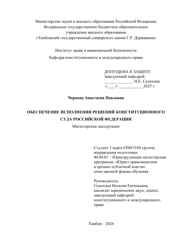 ЧЕРНОВА, АНАСТАСИЯ ПАВЛОВНА. ОБЕСПЕЧЕНИЕ ИСПОЛНЕНИЯ РЕШЕНИЙ КОНСТИТУЦИОННОГО СУДА РОССИЙСКОЙ ФЕДЕРАЦИИ [Электронный ресурс]: магистерская диссертация: 40.04.01 Юриспруденция: Юрист-правозащитник в органах публичной власти: Очно-заочная форма обучения / А. П. ЧЕРНОВА; ТГУ им. Г. Р. Державина ; науч. рук. к. ю. н., доцент, Н. Е. Садохина. — Электрон. текстовые дан. (1 файл). — Тамбов, 2025. — Загл. с титул. экрана. — <URL:https://elibrary.tsutmb.ru/dl/docs/vkr18827.pdf>.