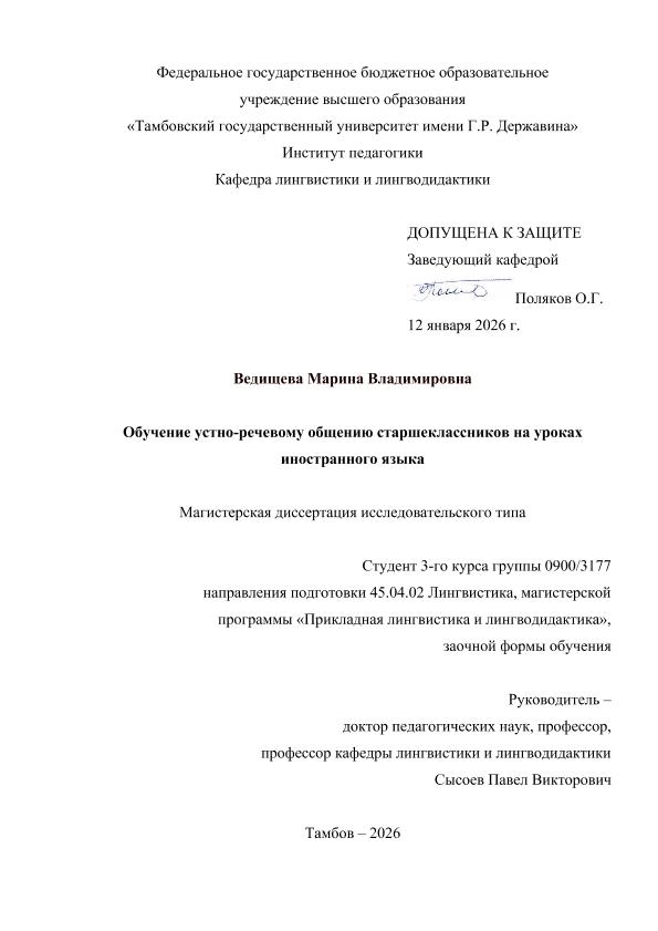 ВЕДИЩЕВА, МАРИНА ВЛАДИМИРОВНА. ОБУЧЕНИЕ УСТНО-РЕЧЕВОМУ ОБЩЕНИЮ СТАРШЕКЛАССНИКОВ НА УРОКАХ ИНОСТРАННОГО ЯЗЫКА [Электронный ресурс]: магистерская диссертация: 45.04.02 Лингвистика: Прикладная лингвистика и лингводидактика: Заочная форма обучения / М. В. ВЕДИЩЕВА; ТГУ им. Г. Р. Державина ; науч. рук. д. пед. н., профессор, П. В. Сысоев. — Электрон. текстовые дан. (1 файл). — Тамбов, 2026. — Загл. с титул. экрана. — <URL:https://elibrary.tsutmb.ru/dl/docs/vkr18828.pdf>.