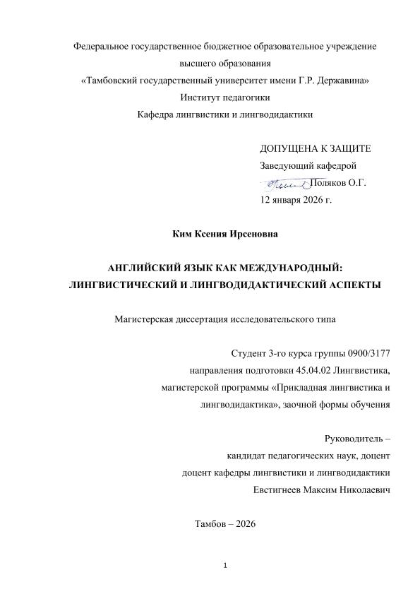 КИМ, КСЕНИЯ ИРСЕНОВНА. АНГЛИЙСКИЙ ЯЗЫК КАК МЕЖДУНАРОДНЫЙ: ЛИНГВИСТИЧЕСКИЙ И ЛИНГВОДИДАКТИЧЕСКИЙ АСПЕКТЫ [Электронный ресурс]: магистерская диссертация: 45.04.02 Лингвистика: Прикладная лингвистика и лингводидактика: Заочная форма обучения / К. И. КИМ; ТГУ им. Г. Р. Державина ; науч. рук. к. пед. н., доцент, М. Н. Евстигнеев. — Электрон. текстовые дан. (1 файл). — Тамбов, 2026. — Загл. с титул. экрана. — <URL:https://elibrary.tsutmb.ru/dl/docs/vkr18829.pdf>.