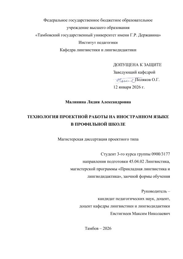 МАЛИНИНА, ЛИДИЯ АЛЕКСАНДРОВНА. ТЕХНОЛОГИЯ ПРОЕКТНОЙ РАБОТЫ НА ИНОСТРАННОМ ЯЗЫКЕ В ПРОФИЛЬНОЙ ШКОЛЕ [Электронный ресурс]: магистерская диссертация: 45.04.02 Лингвистика: Прикладная лингвистика и лингводидактика: Заочная форма обучения / Л. А. МАЛИНИНА; ТГУ им. Г. Р. Державина ; науч. рук. к. пед. н., доцент, М. Н. Евстигнеев. — Электрон. текстовые дан. (1 файл). — Тамбов, 2026. — Загл. с титул. экрана. — <URL:https://elibrary.tsutmb.ru/dl/docs/vkr18830.pdf>.