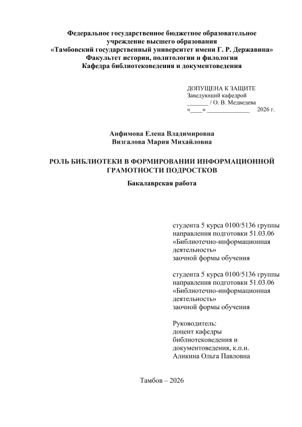 АНФИМОВА, ЕЛЕНА ВЛАДИМИРОВНА. РОЛЬ БИБЛИОТЕКИ В ФОРМИРОВАНИИ ИНФОРМАЦИОННОЙ ГРАМОТНОСТИ ПОДРОСТКОВ [Электронный ресурс]: бакалаврская работа: 51.03.06 Библиотечно-информационная деятельность: Заочная форма обучения / Е. В. АНФИМОВА; ТГУ им. Г. Р. Державина ; науч. рук. к. пед. н., доцент, О. П. Аликина. — Электрон. текстовые дан. (1 файл). — Тамбов, 2026. — Загл. с титул. экрана. — <URL:https://elibrary.tsutmb.ru/dl/docs/vkr18841.pdf>.
