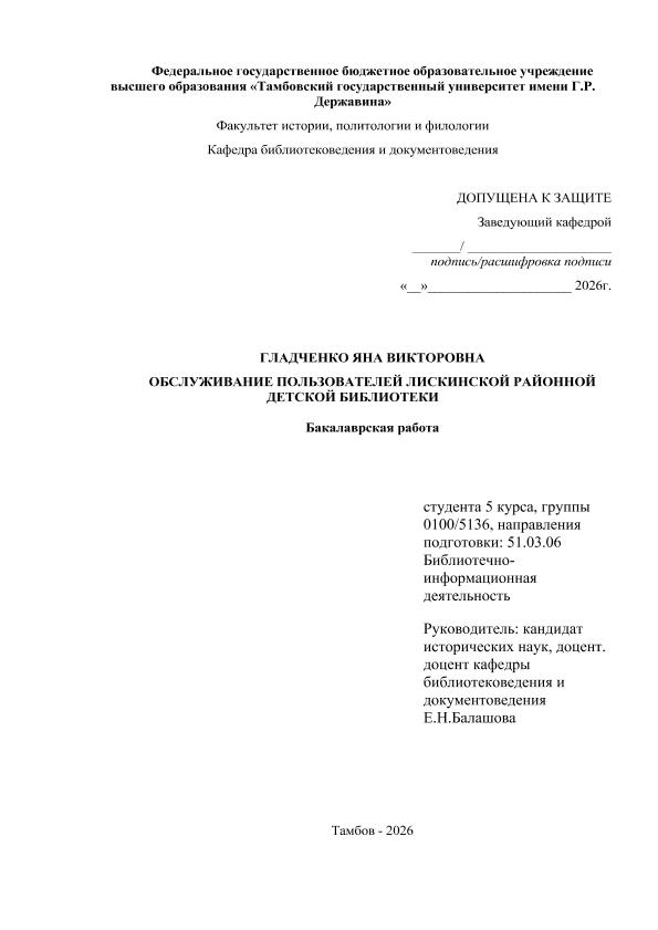 ГЛАДЧЕНКО, ЯНА ВИКТОРОВНА. ОБСЛУЖИВАНИЕ ПОЛЬЗОВАТЕЛЕЙ ЛИСКИНСКОЙ РАЙОННОЙ ДЕТСКОЙ БИБЛИОТЕКИ [Электронный ресурс]: бакалаврская работа: 51.03.06 Библиотечно-информационная деятельность: Заочная форма обучения / Я. В. ГЛАДЧЕНКО; ТГУ им. Г. Р. Державина ; науч. рук. к. и. н., доцент, Е. Н. Балашова. — Электрон. текстовые дан. (1 файл). — Тамбов, 2026. — Загл. с титул. экрана. — <URL:https://elibrary.tsutmb.ru/dl/docs/vkr18842.pdf>.