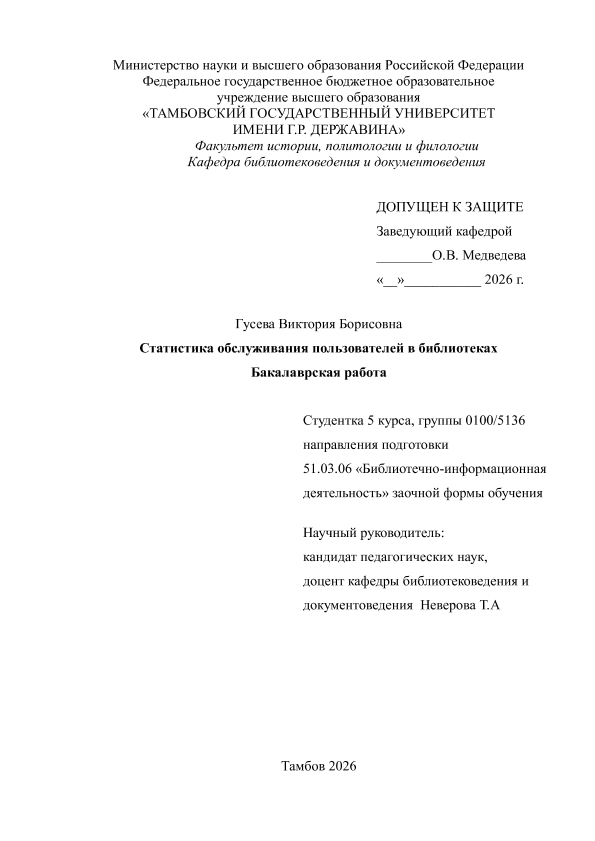 ГУСЕВА, ВИКТОРИЯ БОРИСОВНА. СТАТИСТИКА ОБСЛУЖИВАНИЯ ПОЛЬЗОВАТЕЛЕЙ В БИБЛИОТЕКАХ [Электронный ресурс]: бакалаврская работа: 51.03.06 Библиотечно-информационная деятельность: Заочная форма обучения / В. Б. ГУСЕВА; ТГУ им. Г. Р. Державина ; науч. рук. к. пед. н., доцент, Т. А. Неверова. — Электрон. текстовые дан. (1 файл). — Тамбов, 2026. — Загл. с титул. экрана. — <URL:https://elibrary.tsutmb.ru/dl/docs/vkr18843.pdf>.