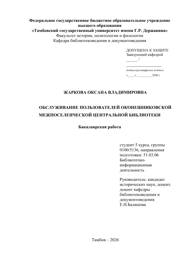 ЖАРКОВА, ОКСАНА ВЛАДИМИРОВНА. ОБСЛУЖИВАНИЕ ПОЛЬЗОВАТЕЛЕЙ ОКОНЕШНИКОВСКОЙ МЕЖПОСЕЛЕНЧЕСКОЙ ЦЕНТРАЛЬНОЙ БИБЛИОТЕКИ [Электронный ресурс]: бакалаврская работа: 51.03.06 Библиотечно-информационная деятельность: Заочная форма обучения / О. В. ЖАРКОВА; ТГУ им. Г. Р. Державина ; науч. рук. к. и. н., доцент, Е. Н. Балашова. — Электрон. текстовые дан. (1 файл). — Тамбов, 2026. — Загл. с титул. экрана. — <URL:https://elibrary.tsutmb.ru/dl/docs/vkr18844.pdf>.