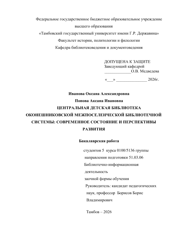 ИВАНОВА, ОКСАНА АЛЕКСАНДРОВНА. ЦЕНТРАЛЬНАЯ ДЕТСКАЯ БИБЛИОТЕКА ОКОНЕШНИКОВСКОЙ МЕЖПОСЕЛЕНЧЕСКОЙ БИБЛИОТЕЧНОЙ СИСТЕМЫ: СОВРЕМЕННОЕ СОСТОЯНИЕ И ПЕРСПЕКТИВЫ РАЗВИТИЯ [Электронный ресурс]: бакалаврская работа: 51.03.06 Библиотечно-информационная деятельность: Заочная форма обучения / О. А. ИВАНОВА; ТГУ им. Г. Р. Державина ; науч. рук. к. пед. н., профессор, Б. В. Борисов. — Электрон. текстовые дан. (1 файл). — Тамбов, 2026. — Загл. с титул. экрана. — <URL:https://elibrary.tsutmb.ru/dl/docs/vkr18845.pdf>.