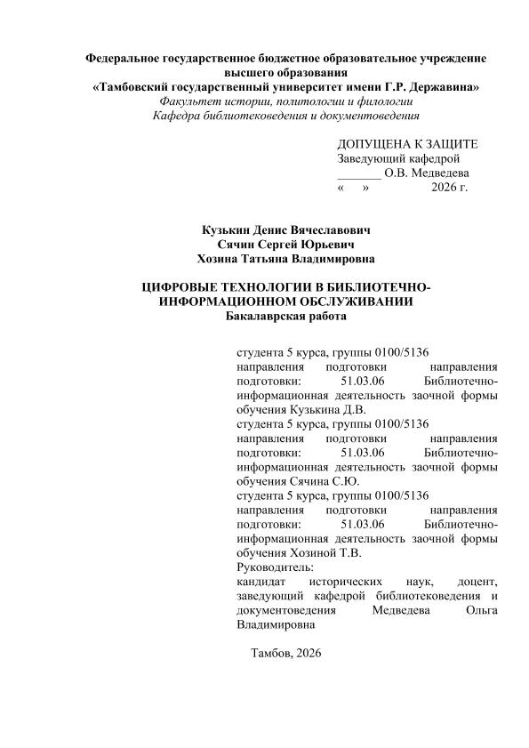 КУЗЬКИН, ДЕНИС ВЯЧЕСЛАВОВИЧ. ЦИФРОВЫЕ ТЕХНОЛОГИИ В БИБЛИОТЕЧНО- ИНФОРМАЦИОННОМ ОБСЛУЖИВАНИИ [Электронный ресурс]: бакалаврская работа: 51.03.06 Библиотечно-информационная деятельность: Заочная форма обучения / Д. В. КУЗЬКИН; ТГУ им. Г. Р. Державина ; науч. рук. к. и. н., доцент, О. В. Медведева. — Электрон. текстовые дан. (1 файл). — Тамбов, 2026. — Загл. с титул. экрана. — <URL:https://elibrary.tsutmb.ru/dl/docs/vkr18846.pdf>.